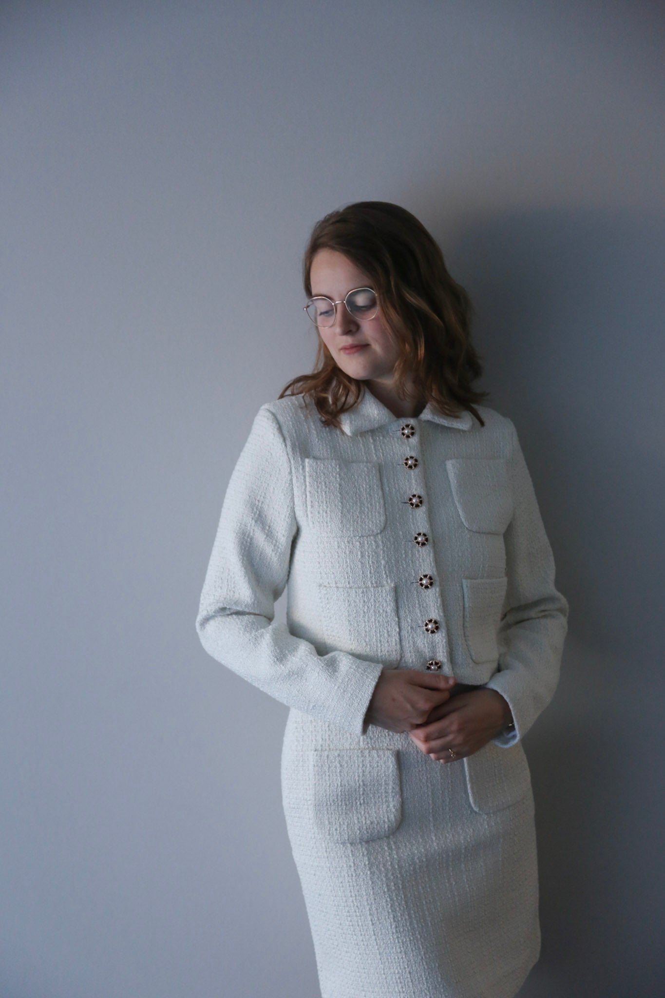 Dit witte bouclé jasje is gemaakt van prachtige kwaliteit stof. Het korte model is afgewerkt met vier voorzakken en gouden knopen met detail, wat zorgt voor een chique look. De rechte pasvorm maakt het jasje geschikt voor zowel zakelijke als feestelijke gelegenheden.