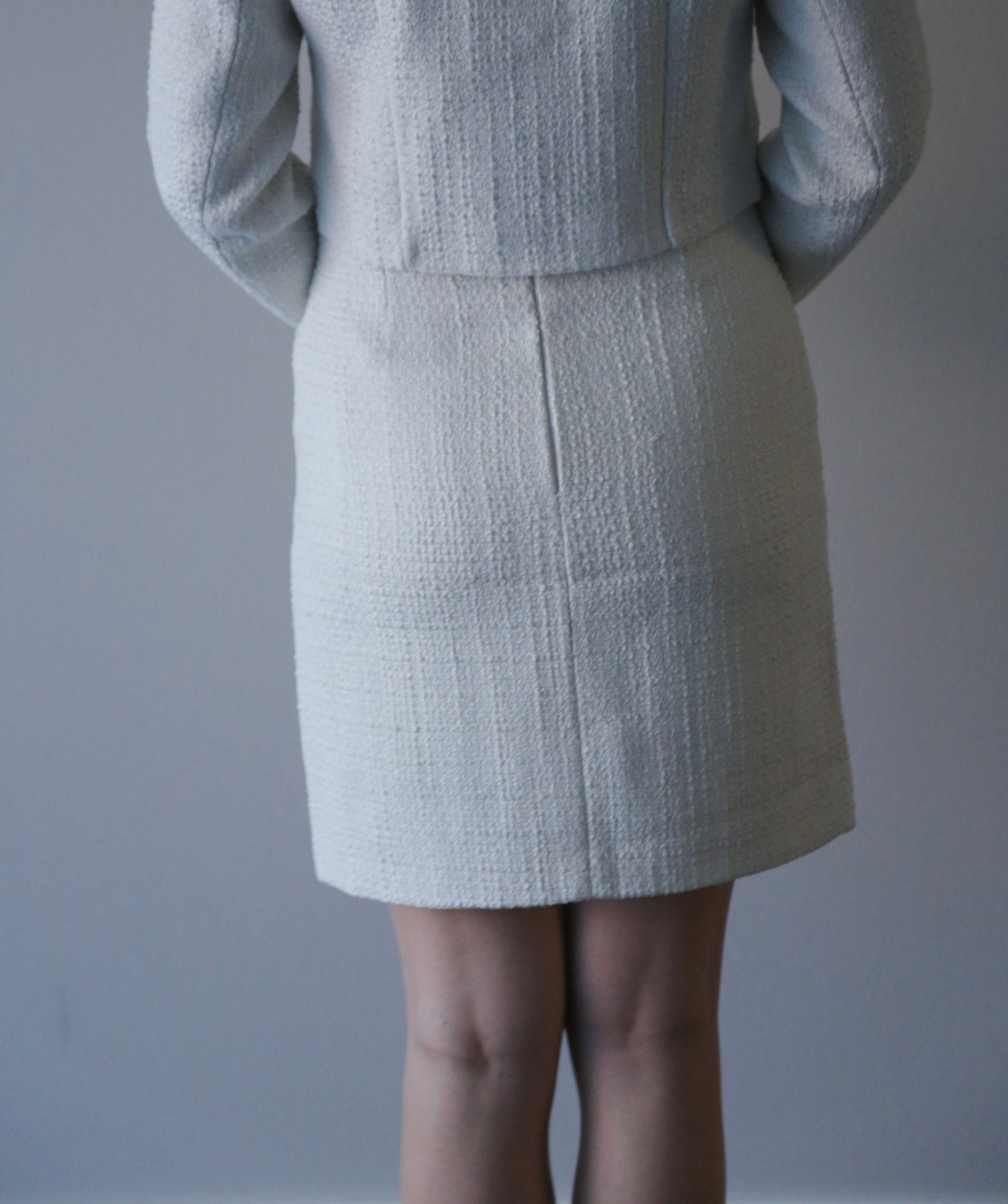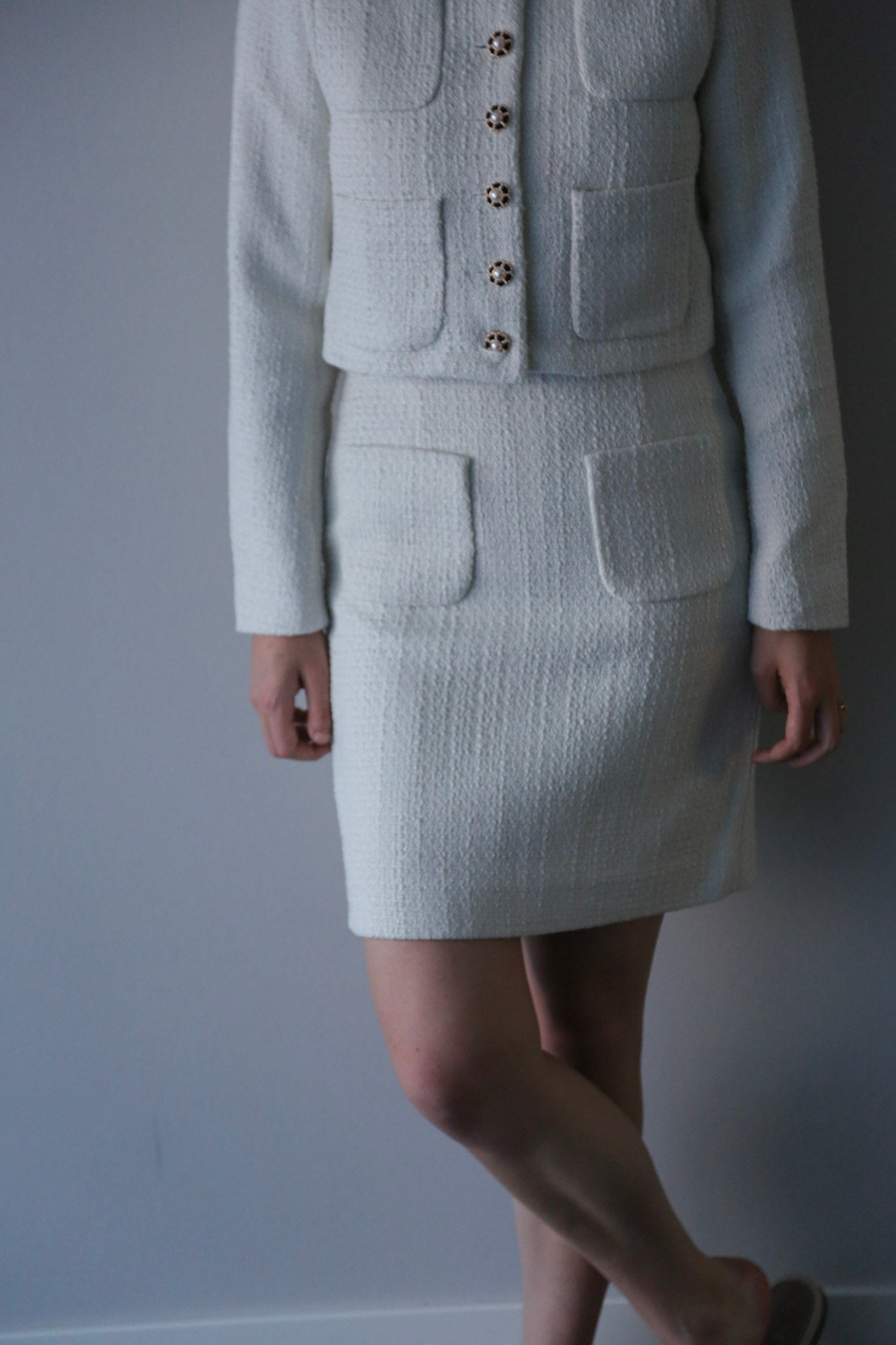 Deze witte bouclé rok is gemaakt van een prachtige kwaliteit stof. De rok heeft een rechte pasvorm en is voorzien van decoratieve zakken aan de voorkant, wat zorgt voor een stijlvol detail.