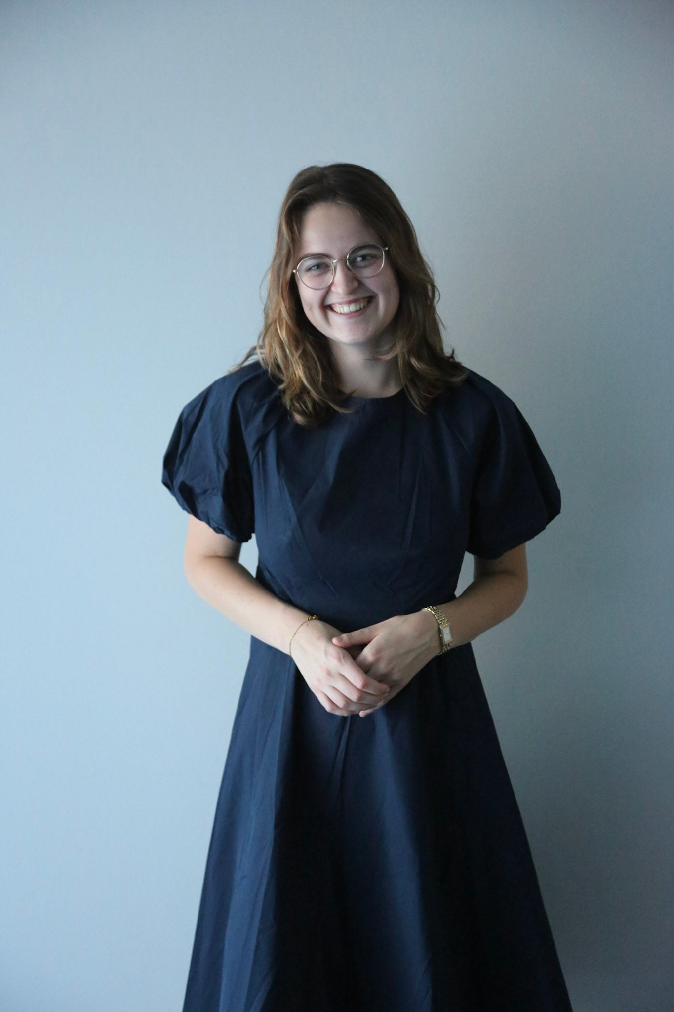 Deze jurk is gemaakt van een gladde katoenblend. De pasvorm is licht getailleerd, met een naad in de taille en een uitlopende rok. De mouwen zijn kort en hebben een subtiele pof, afgewerkt met een smalle elastische zoom. De hals is rond en hooggesloten. Sluiting met een blinde rits en strik aan de achterzijde. En de kers op de taart: deze jurk heeft heerlijke steekzakken!