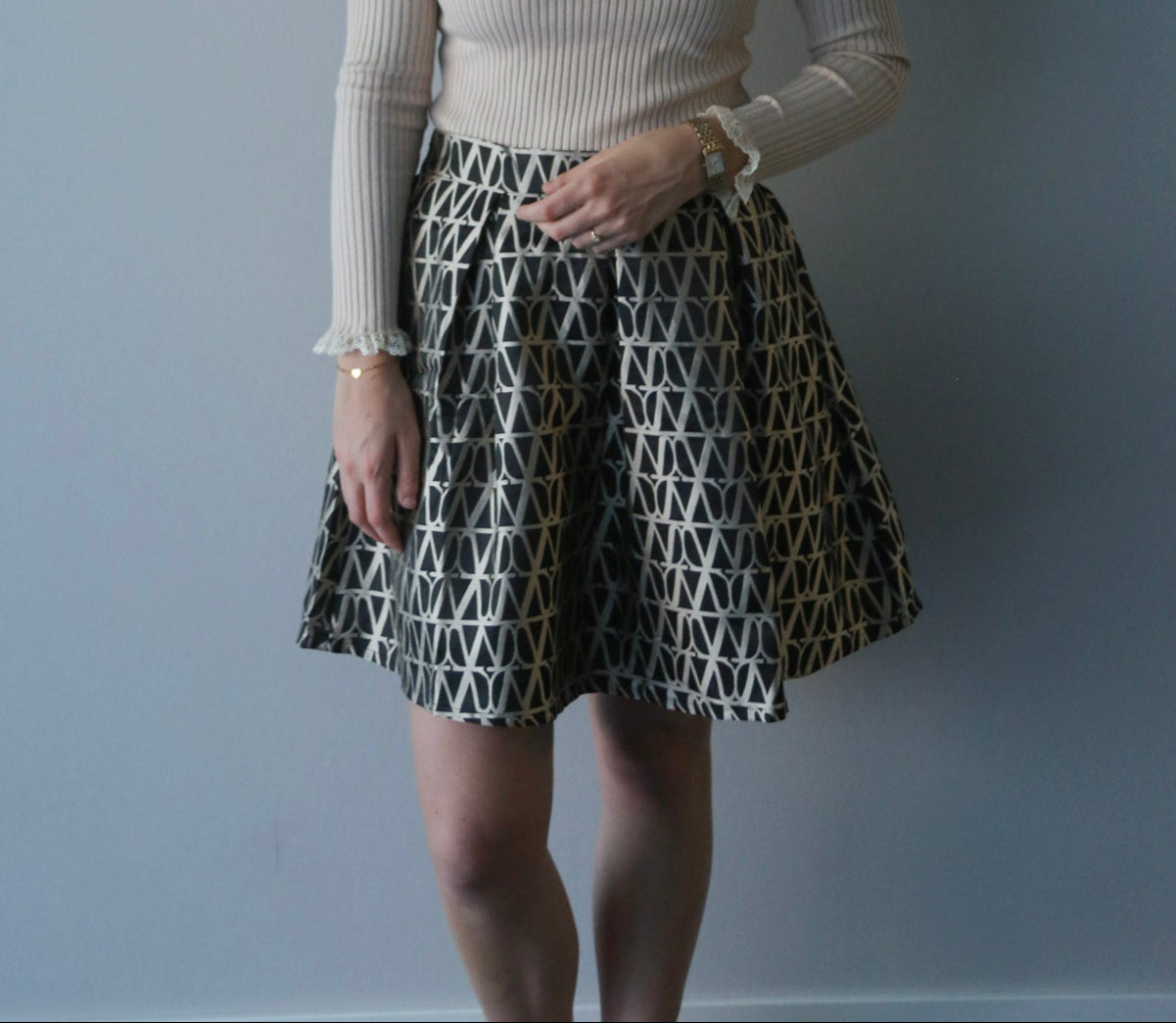 Deze zwart-beige rok met patroon heeft een subtiel glanzende stof die heel mooi valt. De rok heeft plooien die iets wijder uit staan door de dikke stof. De lengte is boven de knie, en er zitten heerlijk ruime steekzakken in! De rok is 1 maat en valt iets ruimer, waardoor deze draagbaar is vanaf een S/M