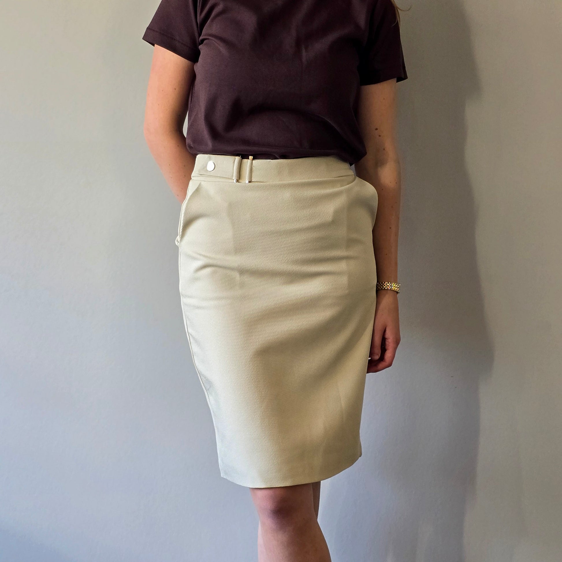 Deze beige kokerrok met bijpassende riem is een elegante must-have voor elke garderobe. De rok heeft een nette, vrouwelijke pasvorm en een subtiele structuur in de stof, waardoor hij perfect is voor zowel kantoor als een diner. De bijgeleverde riem met goudkleurige gesp geeft het geheel een verfijnde touch.