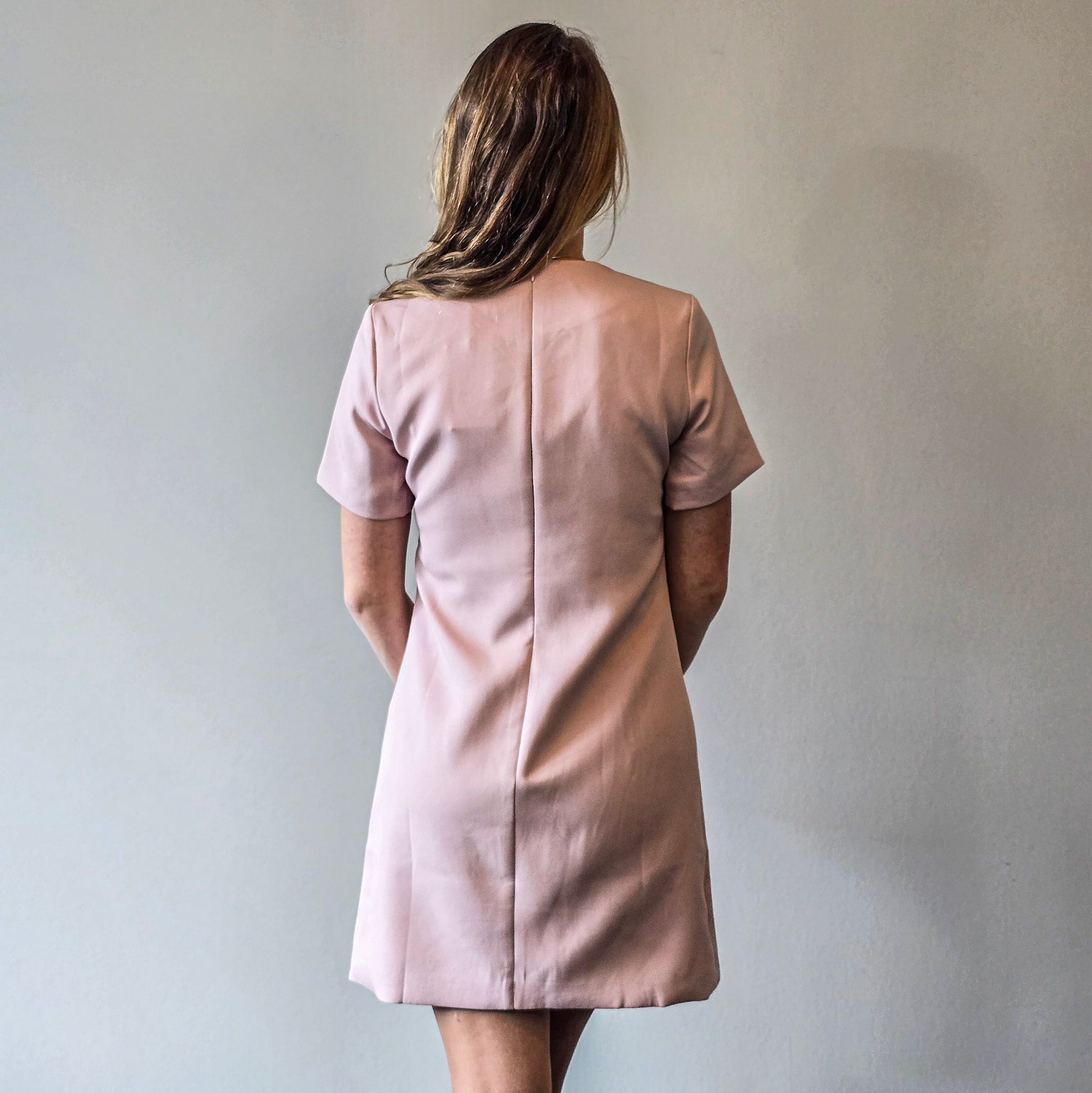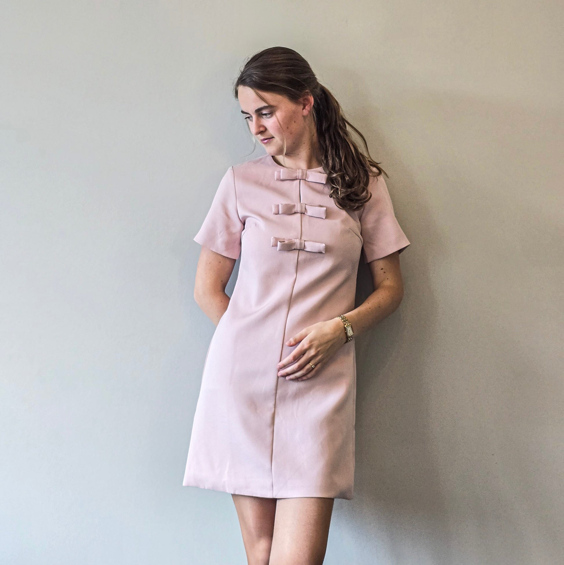 Elegante roze jurk met een subtiele vrouwelijke uitstraling. Het model heeft een klassieke ronde hals, korte mouwen en drie decoratieve strikdetails op de voorkant. De licht uitlopende pasvorm zorgt voor een flatterend silhouet. Perfect voor zowel casual als iets formelere gelegenheden.